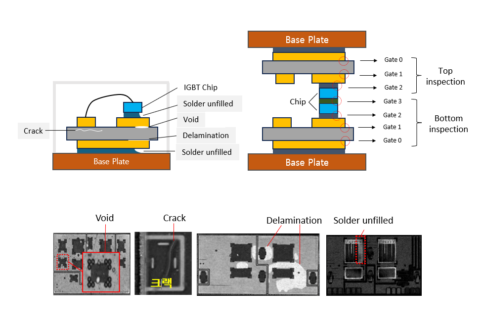 ■ 전력반도체 칩과 DCB or AMB 기판의 솔더 접합면 및 하부 베이스 플레이트 솔더 접합면의 미충진 결함 검사